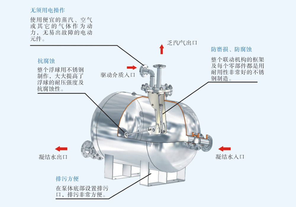 汽/氣動(dòng)力機(jī)械泵凝結(jié)水回收裝置是一種維護(hù)工作少、無(wú)須用電操作,使用蒸汽、空氣或其它不燃無(wú)毒氣體作為驅(qū)動(dòng)介質(zhì)的水資源回收設(shè)備,可將凝結(jié)水或其它液體從較低位置送往較高位置,或從較低壓力或真空送至較高壓力;可用于閉式循環(huán)系統(tǒng),無(wú)蒸汽或閃蒸汽損失,從而把高價(jià)值的熱量回收并返回到系統(tǒng)中;還可放置在水淹坑中,無(wú)觸電或斷路故障隱患。凝結(jié)水的回收溫度高達(dá)185℃,高于傳統(tǒng)離心泵100℃的上限,且無(wú)密封泄漏、無(wú)葉輪磨損或馬達(dá)等電氣元件故障問(wèn)題,減少了停車和維修時(shí)間。