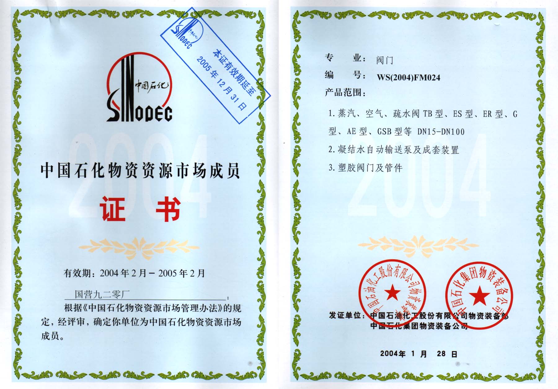 2004年中國石化物資資源市場成員證書
