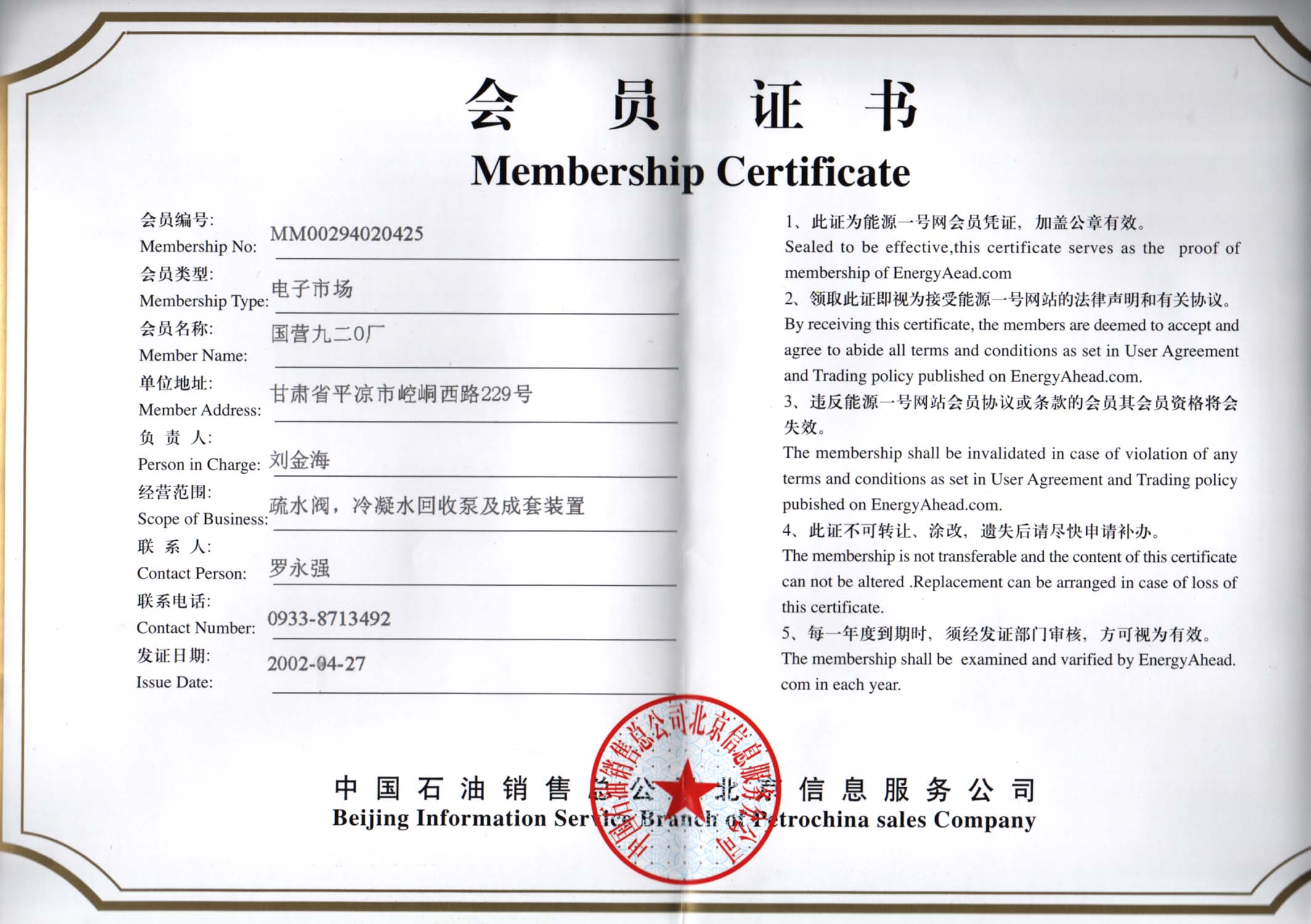 2002年中國石油電子市場會員證